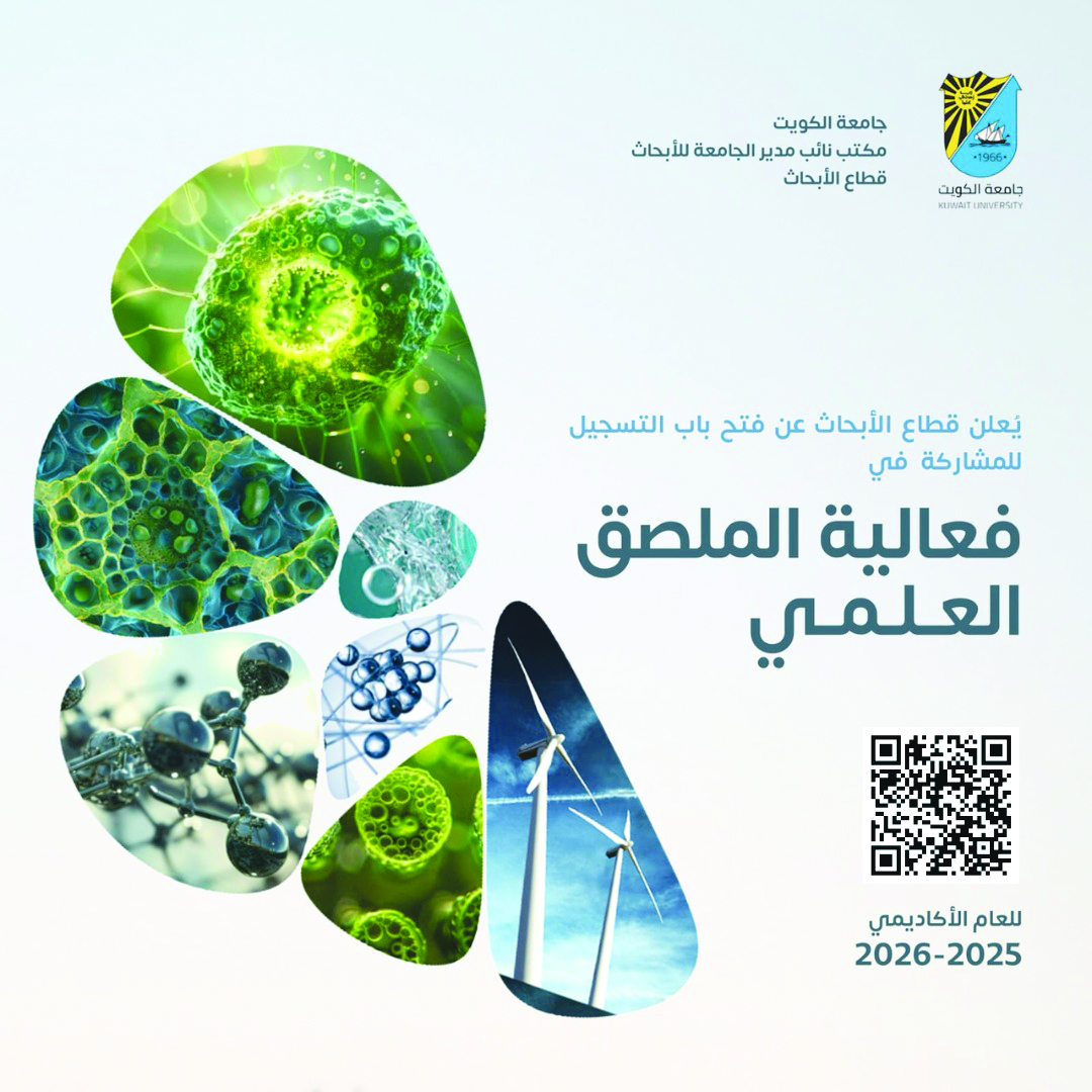 أعلن قطاع الأبحاث عن فتح باب التسجيل والمشاركة في فعالية الملصق العلمي للعام الأكاديمي 2025/2026 وذلك بمشاركة أعضاء الهيئة الأكاديمية والهيئة الأكاديمية المساندة وطلبة الدراسات العليا في جميع كليات جامعة الكويت، و باحثي المؤسسات البحثية المحلية التي ترتبط مع جامعة الكويت باتفاقيات تعاون وهي: مؤسسة الكويت للتقدم العلمي، ومعهد الكويت للأبحاث العلمية، و الرئاسة العامة للحرس الوطني ،و شركة نفط الكويت ، وأكاديمية سعد العبدالله للعلوم الأمنية، والهيئة العامة للتعليم التطبيقي والتدريب، و الهيئة العامة للبيئة.