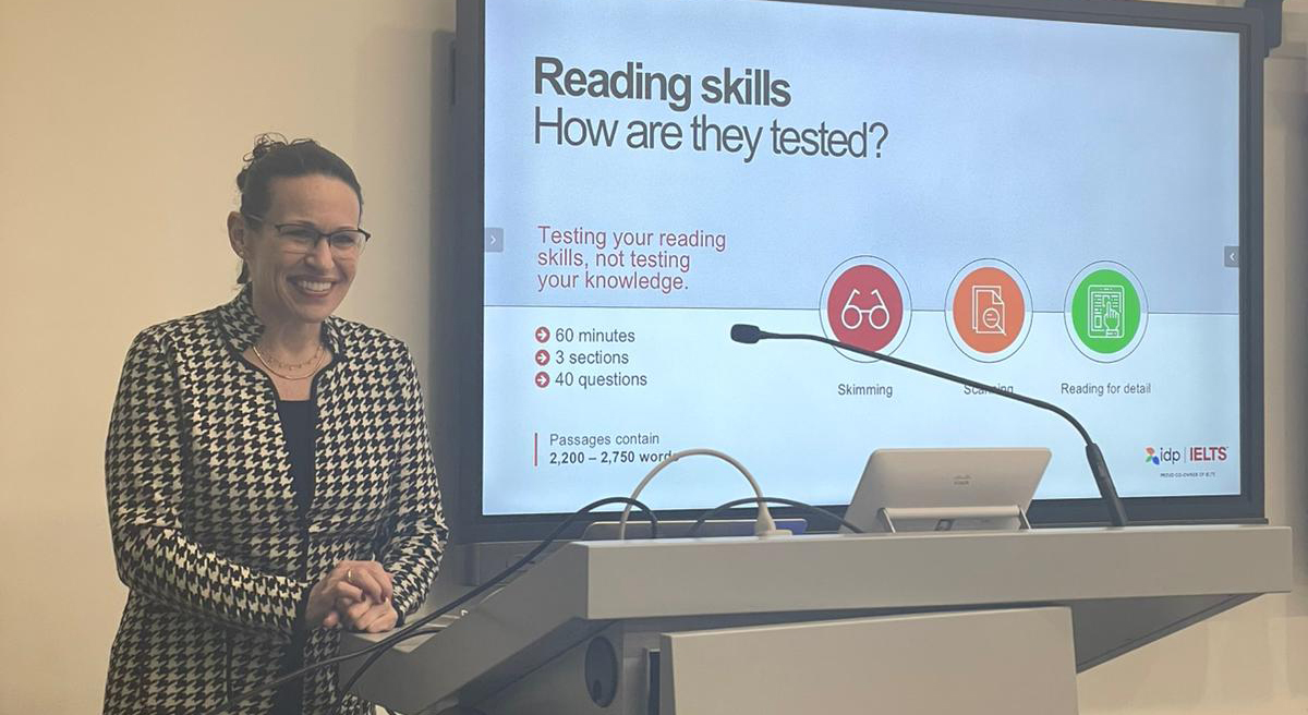 في البداية تطّرقت Monica Readdin – محاضر IELTS إلى نوع الاختبار وكيفية اختياره في الموقع الإلكتروني للتسجيل وهو ( IELTS Acadamic Test ) المكوّن من أربعة أجزاء وهي:( القراءة – الاستماع – الكتابة – المحادثة) مع ضرورة الأخذ بعين الاعتبار التأكد عند التسجيل online من اختيار الوقت والتاريخ المناسب للطالب، حيث لا يسمح بدخول الاختبار بعد بدء الوقت المحدد في ورقة التسجيل.