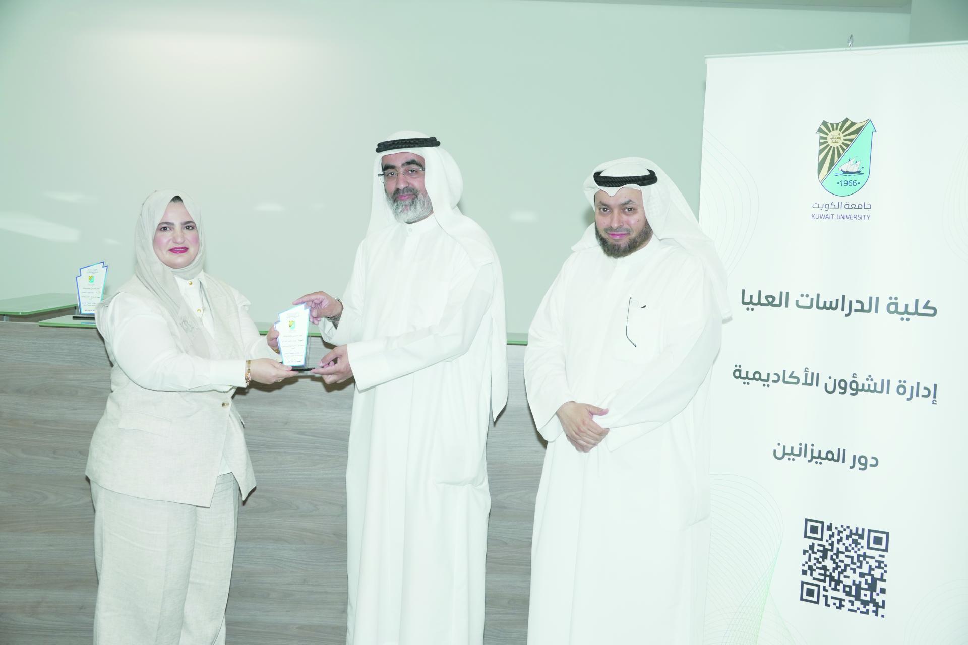 ومن جانبه أعرب عميد كلية الدراسات العليا بالإنابة أ.د. أحمد عبد الله المخيال عن سعادته بلمسة الوفاء هذه والمبادرة لتكريم قطاع الشئون الأكاديمية، مقدماً شكره للعميد المساعد للشئون الأكاديمية أ.د. مشاري خليفة العيفان خلال فترة توليه هذا المنصب، وتحقيق الإنجازات الوظيفية في فترة زمنية محددة للموظفين والطلبة، مؤكداً على أهم الصفات والخصال الحميدة التي يجب أن يتحلى بها الموظف في مركز العمل كالوفاء والأمانة والإخلاص والولاء الوظيفي والعمل بروح الفريق الواحد، متوجهًا بالشكر لهذا القطاع لجهده المتميز بقيادة عمدائه المساعدين، ومتمنياً المزيد من العطاء والتقدم والازدهار.
