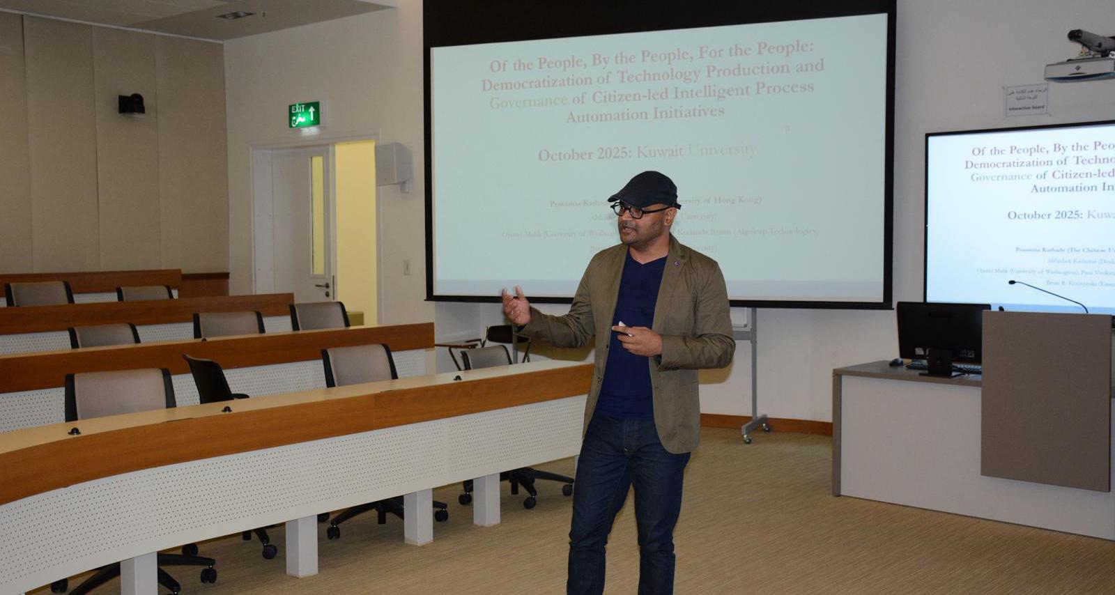 في إطار سعي جامعة الكويت إلى تعزيز التبادل الأكاديمي الدولي وتطوير بيئة البحث العلمي، استضاف مكتب تطوير البحث العلمي بكلية العلوم الإدارية ممثلًا بمشرف مكتب تطوير البحث العلمي بكلية العلوم الإدارية د.أحمد أشكناني، بالتعاون مع قسم نظم المعلومات وإدارة العمليات، د.برسانا كارهدي من كلية إدارة الأعمال بجامعة هونغ كونغ الصينية (CUHK Business School)، ضمن برنامج “الضيف الأكاديمي المتميّز” لشهر أكتوبر 2025.