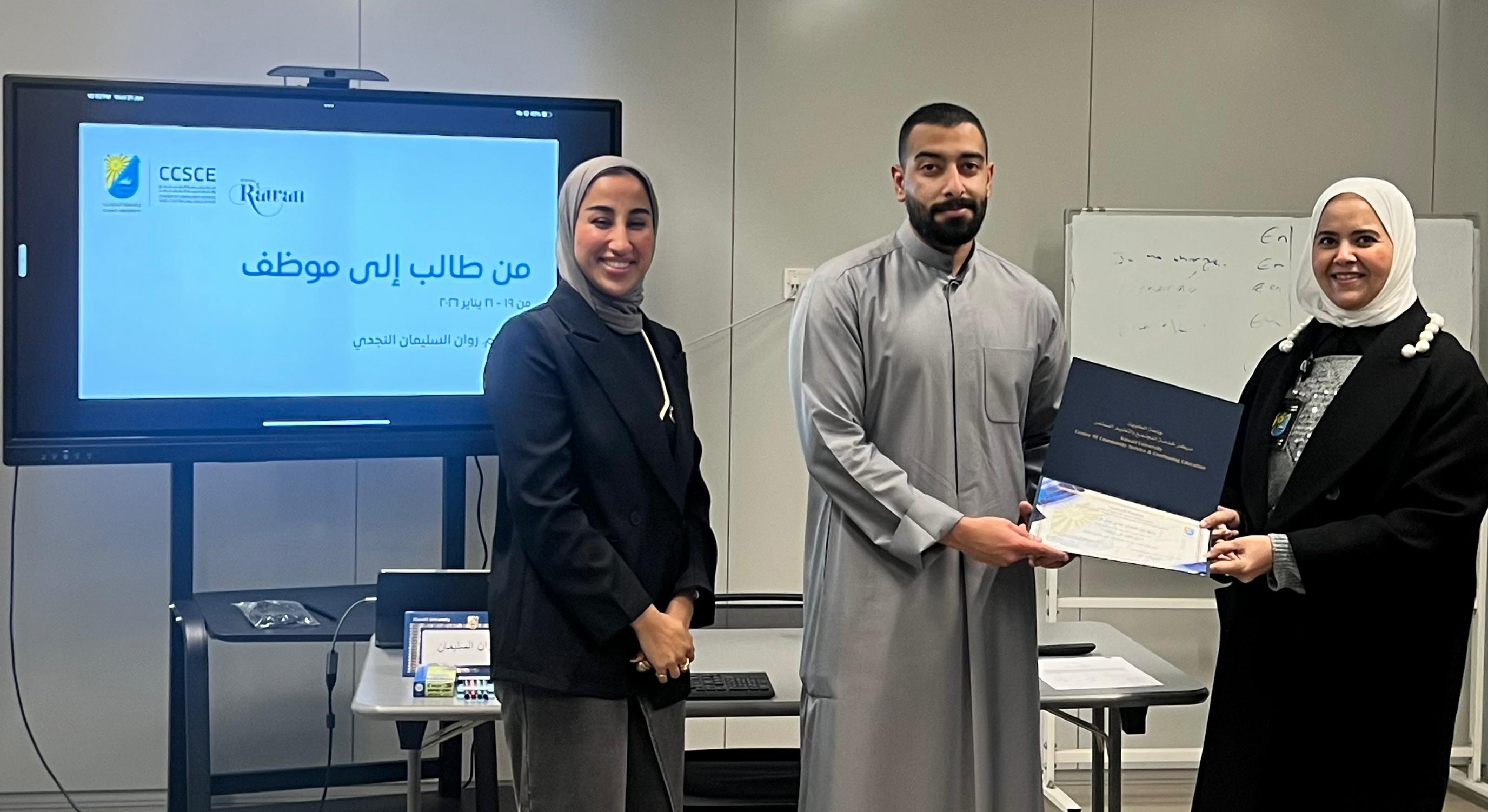 نظم مركز خدمة المجتمع والتعليم المستمر متمثلا بقسم تهيئة الخريجين دورة بعنوان: من طالب إلى موظف في جامعة الكويت وذلك في 19 يناير الماضي بمبنى الإدارة الجامعية في مدينة صباح السالم الجامعية، حاضرت فيها المهندسة روان السليمان والتي تطرقت إلى معرفة الذات وتحديد المسار المهني والمهارات الأساسية لسوق العمل وكتابة السيرة الذاتية والاستعداد للمقابلات مع ثقافة بيئة العمل والتميز المهني.