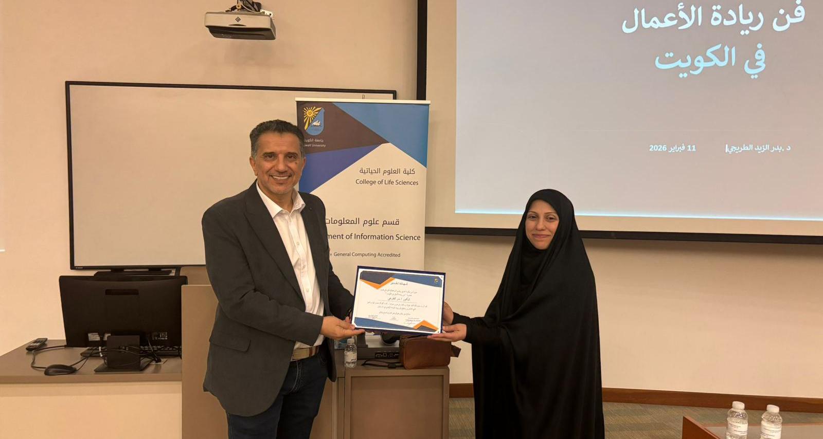 نظّم قسم علوم المعلومات بكلية العلوم الحياتية ندوة بعنوان “فن ريادة الأعمال في الكويت” قدّمها المتخصص في القيادة والتغيير المؤسسي د.بدر الزيد الطريجي، في 11 فبراير الجاري في الكلية.