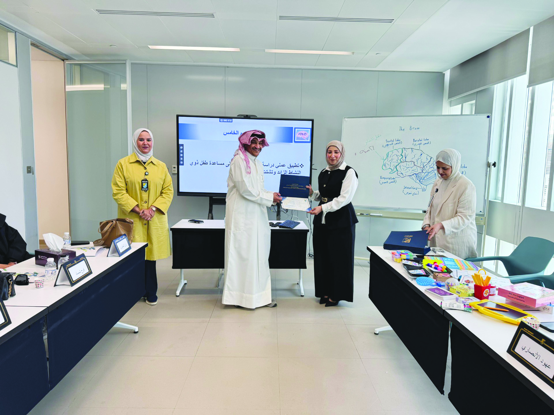 في إطار تعزيز الشراكات المجتمعية وبناء القدرات الوطنية في مجال التربية الخاصة اختتم مركز خدمة المجتمع والتعليم المستمر متمثلاً بقسم البرامج التدريبية ثالث دورة من دورات البرنامج التخصصي والموجه لموظفي الهيئة العامة لشئون ذوي الإعاقة لتأهيلهم وتطوير مهاراتهم المهنية ، والتي تحمل عنوان (اضطراب تشتت الانتباه وفرط الحركة) ، بحضور رئيس قسم التعليم المستمر و القائم بأعمال مدير مركز خدمة المجتمع والتعليم المستمر الفاضلة منيرة الباز، والقائم بأعمال رئيس قسم البرامج التدريبية السيدة نورة المزيني، ومدير إدارة الشئون الإدارية والنائب عن مديرة الهيئة العامة لشئون ذوي الإعاقة أحمد الفضلي، حاضرت فيها د. ايمان العرادي.