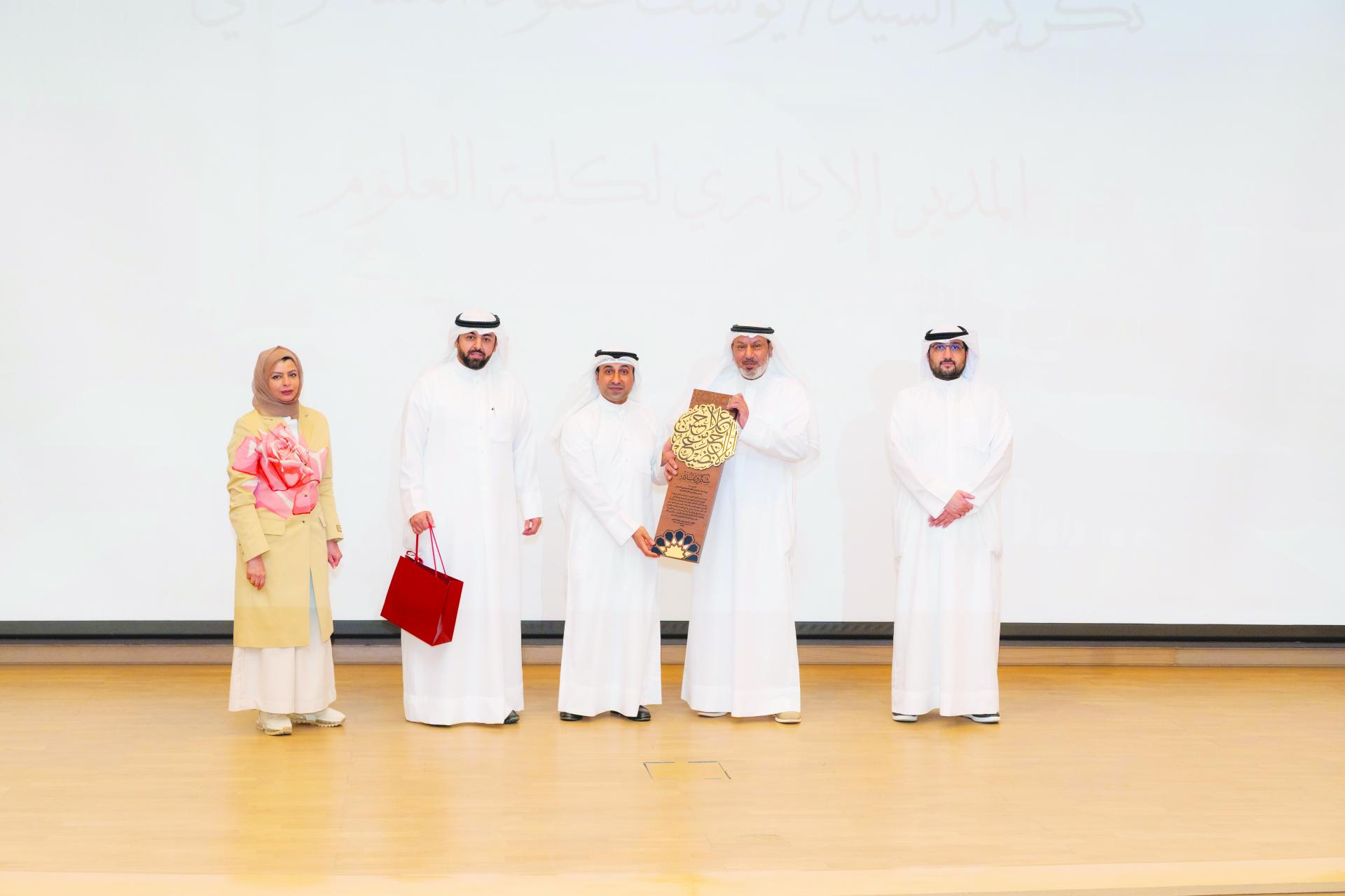 وقد شهد الحفل حضور أ.د.سوزان البستان مساعد العميد للشؤون الأكاديمية والأبحاث والدراسات العليا – و د.فارس العازمي مساعد العميد للتخطيط والاستشارات والتدريب - ود.عبد العزيز السنافي مساعد العميد للشؤون الطلابية، ورؤساء الأقسام العلمية، ومدراء