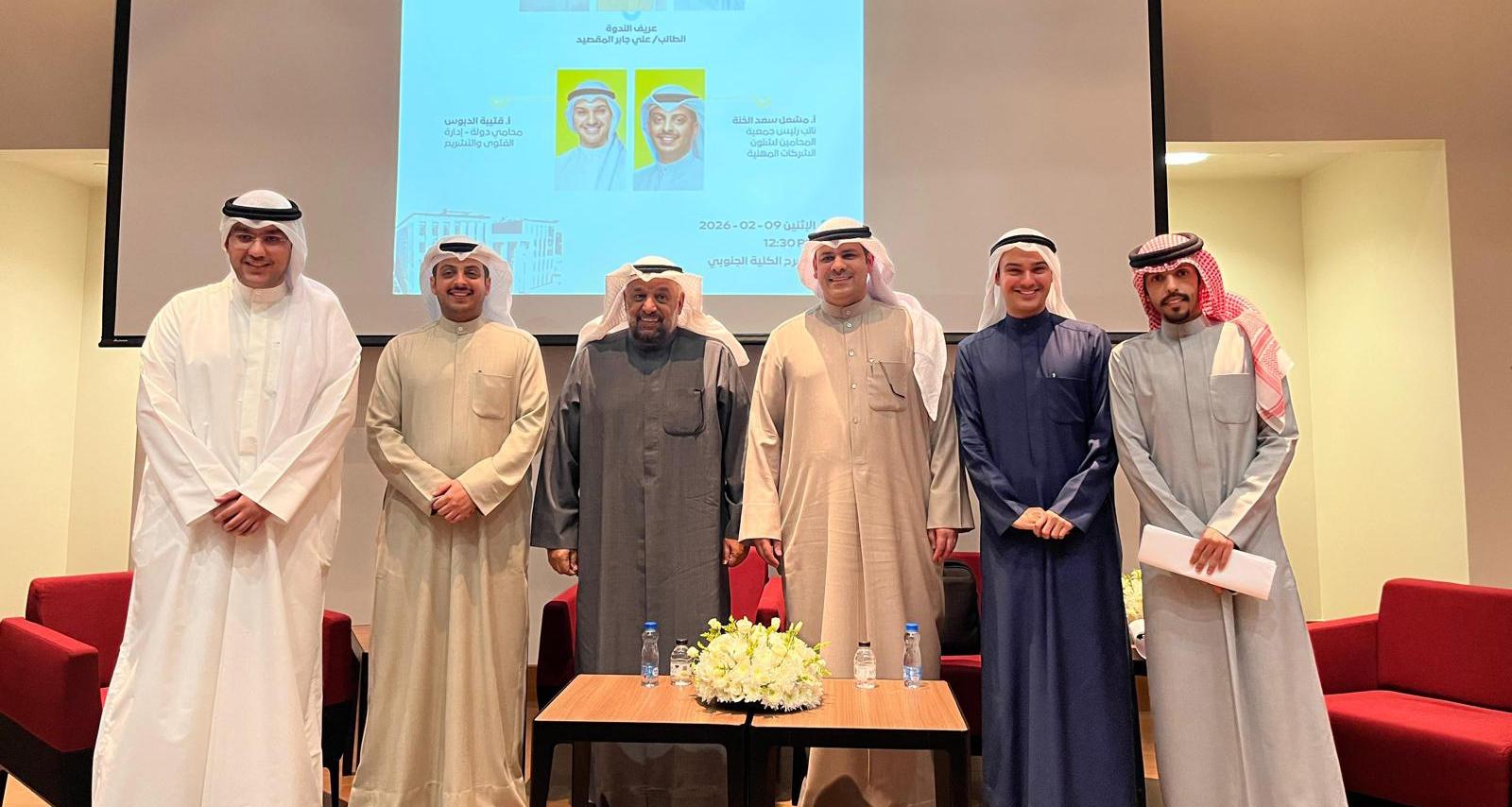 وشارك في الندوة كل من عضو هيئة التدريس بقسم القانون الخاص د.محمد المطيري، ومدير مركز التدريب التخصصي بالإدارة العامة للتحقيقات د.إبراهيم الشرقاوي، ومحامي دولة بإدارة الفتوى والتشريع قتيبة الدبوس، ونائب رئيس جمعية المحامين لشئون للشركات المهنية مشعل الخنة.