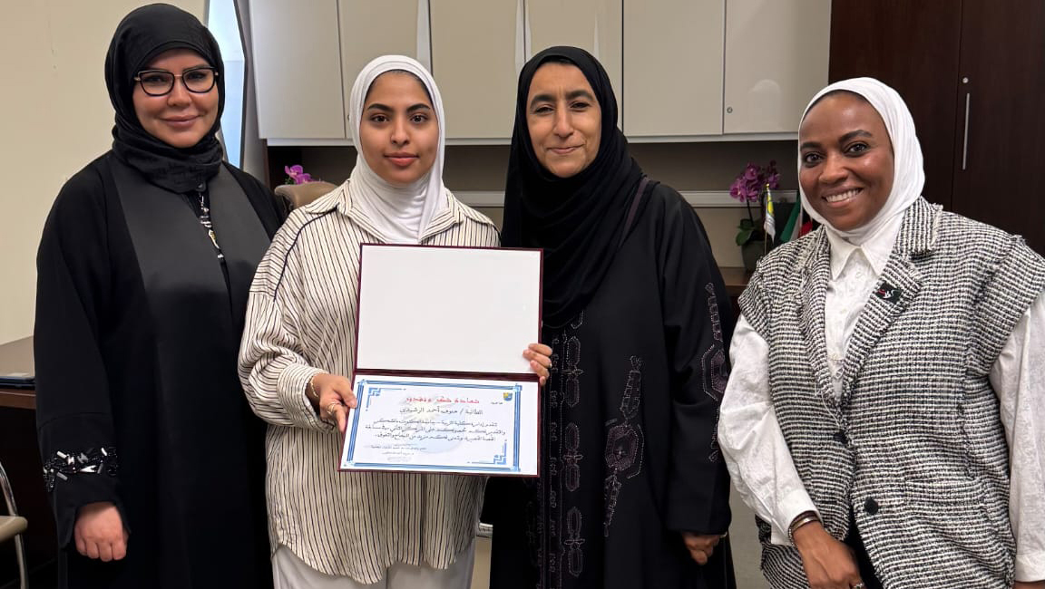 وشهد الحفل تكريم الطالبة نورة عبد الله خميس الناصر لحصولها على المركز الأول عن قصتها بعنوان «معادلة النهضة»، كما تم تكريم الطالبة هنوف أحمد الرشيدي الحاصلة على المركز الثاني عن قصتها «دفاتر الأجداد وشاشات الأحفاد».